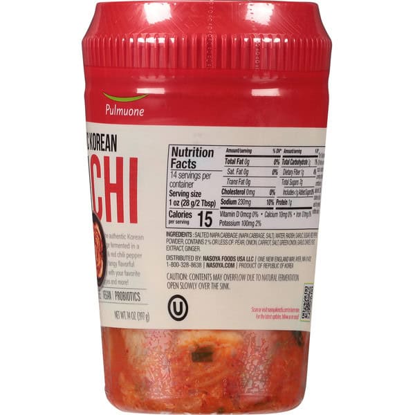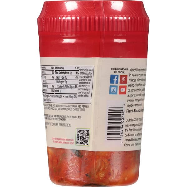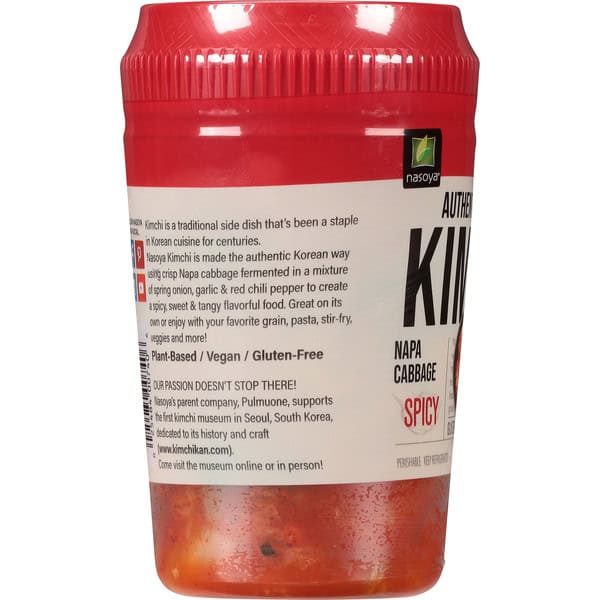 Gluten-free. Vegan. Pulmuone. Authentic Korean. Kim chi is a traditional side dish that’s been a staple in Korean cuisine for centuries. Nasoya Kim chi is made the authentic Korean way using crisp cabbage fermented in a mixture of spring onion, garlic & red chili pepper to create a spicy, sweet & tangy flavorful food. Plant-based.