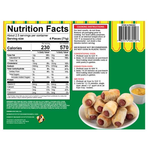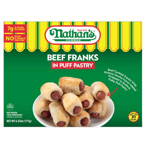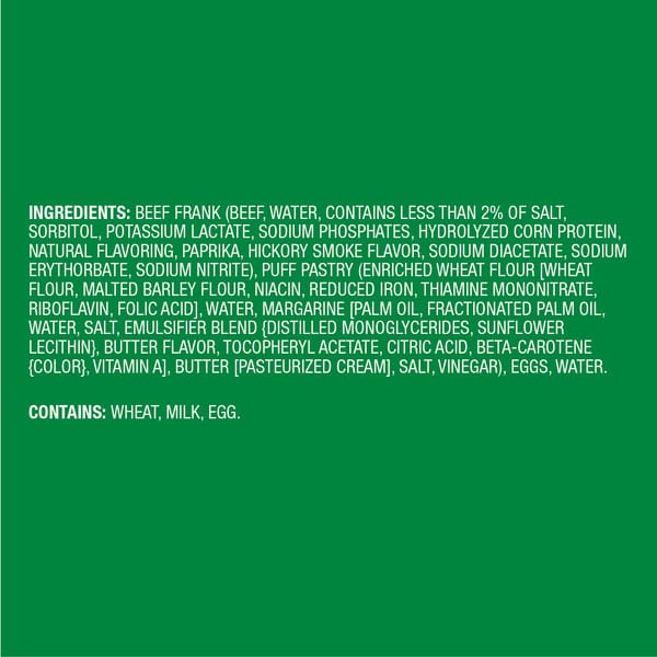 Beef Frank (beef, Water, Contains Less Than 2% Of Salt, Sorbitol, Potassium Lactate, Sodium Phosphates, Hydrolyzed Corn Protein, Natural Flavoring, Paprika, Hickory Smoke Flavor, Sodium Diacetate, Sodium Erythorbate, Sodium Nitrite), Puff Pastry (enriched Wheat Flour [wheat Flour, Malted Barley Flour, Niacin, Reduced Iron, Thiamine Mononitrate, Riboflavin, Folic Acid], Water, Margarine [palm Oil, Fractionated Palm Oil, Water, Salt, Emulsifier Blend {distilled Monoglycerides, Sunflower Lecithin}, Butter Flavor, Tocopheryl Acetate, Citric Acid, Beta-carotene {color}, Vitamin A], Butter [pasteurized Cream], Salt, Vinegar), Eggs, Water