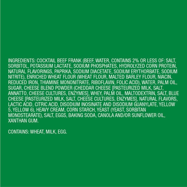 Cocktail Beef Frank (beef, Water, Contains 2% Or Less Of: Salt, Sorbitol, Potassium Lactate, Sodium Phosphates, Hydrolyzed Corn Protein, Natural Flavorings, Paprika, Sodium Diacetate, Sodium Erythorbate, Sodium Nitrite), Enriched Wheat Flour (wheat Flour, Malted Barley Flour, Niacin, Reduced Iron, Thiamine Mononitrate, Riboflavin, Folic Acid), Water, Palm Oil, Sugar, Cheese Blend Powder (cheddar Cheese [pasteurized Milk, Salt, Annatto, Cheese Cultures, Enzymes], Whey, Palm Oil, Maltodextrin, Salt, Blue Cheese [pasteurized Milk, Salt, Cheese Cultures, Enzymes], Natural Flavors, Lactic Acid, Citric Acid, Disodium Inosinate And Disodium Guanylate, Yellow 5, Yellow 6), Heavy Cream, Corn Starch, Yeast (yeast, Sorbitan Monostearate), Salt, Eggs, Baking Soda, Canola And/or Sunflower Oil, Xanthan Gum