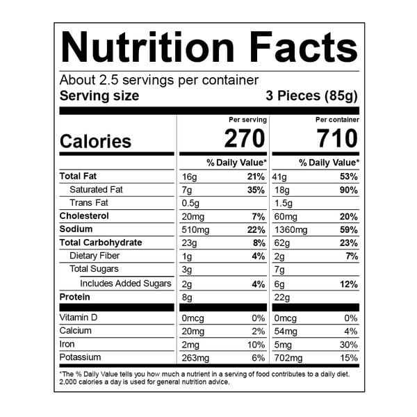 Cooking Instructions: Keep Frozen. Not ready to eat. Cook thoroughly. Remove plastic wrap and take out of plastic tray. Conventional Oven (Preferred Method): Pre-heat oven to 375 degrees F. Place on parchment lined baking pan about 1/2 inch apart. Cook for 18-20 minutes or until golden brown. Air Fryer: Pre-heat air fryer to 300 degrees F. Place on air fryer safe pan about 1/2 inch apart. Cook for 10-12 minutes or until golden brown. To avoid sticking please use aluminum foil (without non-stick cooking spray) or non-stick cooking spray. Let stand for a few minutes before serving. For food safety purposes, cook to an internal temperature of 165 degrees F as measured by a food thermometer.