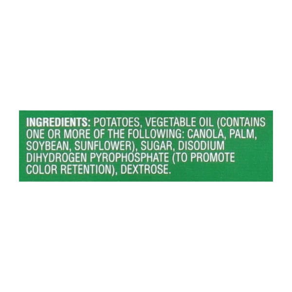 Potatoes, Vegetable Oil (contains One Or More Of The Following: Canola, Palm, Soybean, Sunflower), Sugar, Disodium Dihydrogen Pyrophosphate (to Promote Color Retention), Dextrose