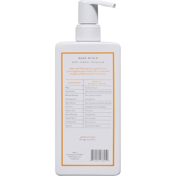 IngredientsWater, Cetyl Alcohol, Behenamidopropyl Dimethylamine, Stearyl Alcohol, Glutamic Acid, Citric Acid, Fragrance, Sodium Benzoate, Caprylyl Glycol, 1, 2-hexanediol