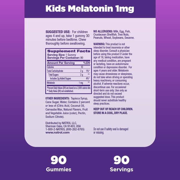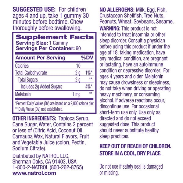Natrol Kids Melatonin 1 mg gummies are melatonin gummies for kids that offer a convenient and easy-to-take option to help with occasional sleeplessness and are safe and effective for ages 4 and up.(1) This melatonin nighttime sleep aid supplement is 100% drug-free, and non-habit forming, gelatin-free, and made with clean ingredients, no synthetic dyes and no artificial flavors and sweeteners. Natrol Kids melatonin supplements for sleeping offer 1 mg of melatonin per serving, providing the sleep support your child needs to fall asleep faster and stay asleep longer.(1) Natrol Melatonin promotes sleep in as little as 15 minutes.(1) Natrol’s pectin-based, vegetarian gummy formula and great-tasting raspberry flavor make these sleep aid gummies easier to chew than standard gelatin gummies. Suggested Use: For children ages 4 and up, take one gummy 30 minutes before bedtime. Chew thoroughly before swallowing. Natrol is dedicated to creating innovative, quality products, to help you maintain good health and thrive in your busy, modern lifestyle. (1)These statements have not been evaluated by the Food and drug administration. This product is not intended to diagnose, treat, cure or prevent any disease. (2)Nielsen, xAOC, 52 weeks ending 10/26/24, Sleep Aid Supplements