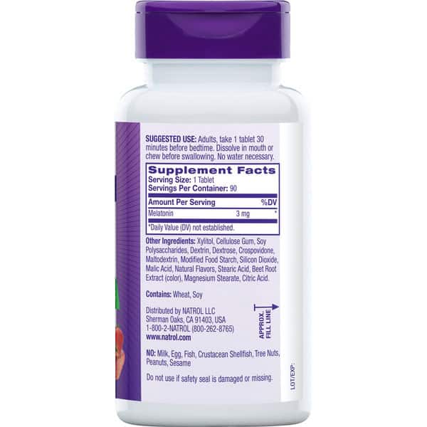 Natrol Fast Dissolve Melatonin 3 mg tablets are sleep support for adults that offer a convenient and easy-to-take option to help with occasional sleeplessness.(1) This adult melatonin nighttime sleep aid supplement is 100% drug-free, and non-habit forming. Natrol melatonin supplements for sleeping offer 3 mg of melatonin per serving, providing the sleep support you need to fall asleep faster and stay asleep longer.(1) Natrol Melatonin fast dissolve tablets promote sleep in as little as 15 minutes.(1) Natrol’s fast dissolving, vegetarian sleep supplements formula with great-tasting strawberry flavor make these sleep aid tablets convenient to take before bed. Suggested Use: Adults, take one melatonin 3 mg fast dissolve tablet 30 minutes before bedtime. Dissolve in mouth or chew before swallowing. No water necessary. Natrol is dedicated to creating innovative, quality products, to help you maintain good health and thrive in your busy, modern lifestyle. (1)These statements have not been evaluated by the Food and drug administration. This product is not intended to diagnose, treat, cure or prevent any disease. (2)Nielsen, xAOC, 52 weeks ending 10/26/24, Sleep Aid Supplements