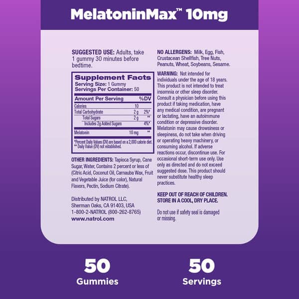 • Clean Ingredients: Natrol Melatonin Max Gummies are vegetarian, gelatin-free and non-GMO; Free from artificial flavors, sweeteners or synthetic dyes