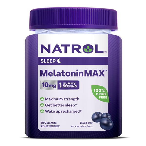 Natrol MelatoninMax provides the maximum strength recommended amount of 10mg of melatonin in a single gummy to help support a restful night’s sleep(1). These adult melatonin gummies are 100% drug-free, made with clean ingredients, no synthetic dyes, artificial flavors or sweeteners. This non-GMO melatonin sleep support(1) supplement excludes common food allergens. Trust Natrol melatonin supplements for sleeping to help you get the rejuvenating sleep you need tonight, so you can wake up rested and ready to take on tomorrow.(1) Natrol’s pectin-based sleep support for adults gummies with a delicious, blueberry flavor are easier to chew and less likely to stick to your teeth than standard gelatin gummies. Adults, take one gummy 30 minutes before bedtime. Natrol is dedicated to creating innovative, quality products, to help you maintain good health and thrive in your busy, modern lifestyle. (1)These statements have not been evaluated by the Food and Drug Administration. This product is not intended to diagnose, treat, cure or prevent any diseases.