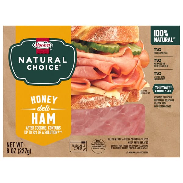 Lunch meat with no artificial ingredients and 100% natural, minimally processed meat. HORMEL NATURAL CHOICE Honey Ham deli meat gives delicious flavor with none of the extra preservatives. Slow roasted, our honey pork ham is free of MSG and includes no nitrates or nitrites (except in cultured celery powder and sea salt). HORMEL NATURAL CHOICE Honey Deli Ham provides 10 grams of protein and 70 calories per serving. Fully cooked and ready to eat, craft delicious ham sandwiches, stack with crackers and cheese for an afternoon snack, or make it a keto-friendly part of your diet or daily routine. When you crave sweet and savory taste, HORMEL NATURAL CHOICE cold cuts with slow-roasted flavor are a great option. Includes one 8 oz resealable plastic package of HORMEL NATURAL CHOICE Honey Deli Ham. Safe Handling: Keep refrigerated. All trademarks, logos and images are owned by Hormel Foods Corporation, its subsidiaries and affiliates. Copyright Hormel Foods, LLC.