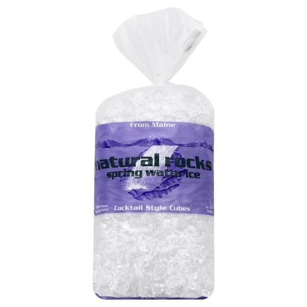 100% pure spring water. From Maine. Natural rocks are square cocktail style ice cubes made from 100% pure Maine spring water. Natural rocks ice company selects only the best quality spring water to produce premium crystal clear ice. The spring water used in making this ice is protected by acres of Maine conservation land and evergreen forests. The natural mineral content. In our premium spring water produces a harder clearer ice with no sodium and no aftertaste. When you use natural rocks ice to chill your favorite beverage, you taste the drink, not the ice. The original spring water ice, since 1990. www.naturalrocks.com. Protect our earth. Reuse this bag. Spring Water Source: Fryeburg Maine.