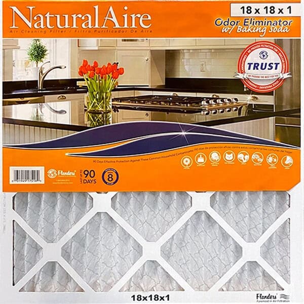 18 x 18 x 1 (Actual Filter Size: 17-3/4 x 17-3/4 x 3/4 inches). Odor eliminator w/ baking soda. Trust: We provide the best for you. Pharmaceutical laboratories. We provide filtration for. Nuclear container. Space programs. Foremost in air filtration. Last up to 90 days. 90 days effective protection against these common household contaminants. Pollen. Dust. Dust mite. Pet dander. Mold. Bacteria. Odor. Get to know your filter. Who Is Flanders Filters? Founded in 1950, we are the largest and most diverse manufacturer of filtration products in the industry, providing the most types and sizes of air filters available. In addition to filters for your home use, we also manufacture commercial, industrial, and high purity filters and air filtration equipment to service a customer base consisting of the top companies in the industrial, semiconductor, pharmaceutical, biotechnology, and nuclear markets, as well as the space programs. This focus on air filtration allows us to maintain and invest in air filtration only, as opposed to diluting research funds into developing products unrelated to air filtration. So when we say Trust, We Provide the Best for You – it’s not just a motto, it’s a statement you can believe in. How Does Flanders Test Their Filters? Our filters are tested at independent air filter testing facilities that are members of the National Air Filtration Association (NAFA). These test facilities utilize a true and proven scientific method for air filter testing created by the American Society of Heating, Refrigeration, and Air conditioning Engineers, ASHRAE 52.2-2007. Some filter manufacturers use their own rating system, which is not approved as an industry standard. What Is a MERV Rating? Minimum efficiency reporting value, or MERV for short, is a filter rating system devised by ASHRAE, the American Society of Heating, Refrigeration, and Air Conditioning Engineers, to standardize and simplify air filter efficiency ratings for the public. The higher the MERV rating, the higher the effectiveness of the air filter. Simply stated, a MERV 13 filter will remove larger amounts of small particles from the air than a MERV 8 filter. MERV ratings allow you to effectively compare one type or brand of filter to another. For example, the EPA guidance for indoor air quality in schools recommends filters between MERV 8 and MERV 13. By comparison, the typical fiberglass throwaway filter used in most homes has a rating of MERV 4 or less. If allergies or asthma are your concern, we suggest you choose a MERV 8 filter at a minimum. About the Naturalaire Odor Eliminator W/baking Soda: Flanders NaturalAire Odor Eliminator w/ Baking Soda is a pleated filter with the addition of a sodium bicarbonate that maintains a healthy pH balance. This natural, non-toxic additive helps trap contaminants and eliminates food, pet, and human odors rather than cover them up. Each fiber within the filter is coated with baking soda giving them a fuzzy covering. This fuzziness enhances odor removal and increases the contact area for dust to be captured by the filter. With a MERV 8 rating, the Flanders NaturalAire Odor Eliminator w/ Baking Soda not only offers superior odor filtration, it also provides protection against many other common household contaminants such as dust mites and those that aggravate allergies like pet dander and pollen. To ensure the best possible air quality for your home and family, it is important to change your filters as recommended. Beyond recommended change interval. Recommended change interval. New filter. Greater Filter Surface Area for Longer Life and Better Energy Efficiency. The more filter area you have, the better the ability to trap dirt, pollen and other particles. NaturalAire pleated filter design provides more filtration surface area. It’s like having more than one filter. Did You Know? Baking soda is also known as sodium bicarbonate, bicarbonate of soda, sodium hydrogencarbonate, and nahcolite. It may also commonly be referred to as bread soda, or cooking soda. Baking soda is both a naturally occurring material, present in most organic life forms and produced artificially. Baking soda has disinfectant and antiseptic properties and can be an effective fungicide against some organisms. Baking soda is able to react as both an acid and a base. Ashrae Rating: 8 MERV. UL listed. Air filter unit as to flammability only 524L. FlandersCorp.com.