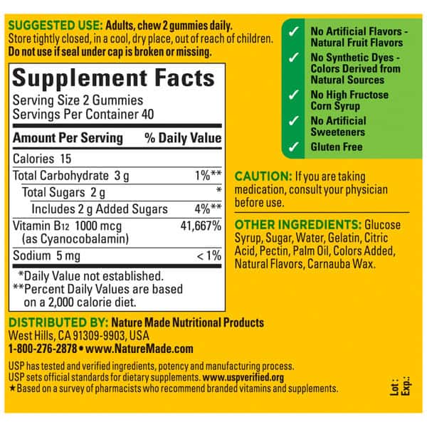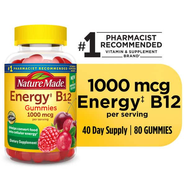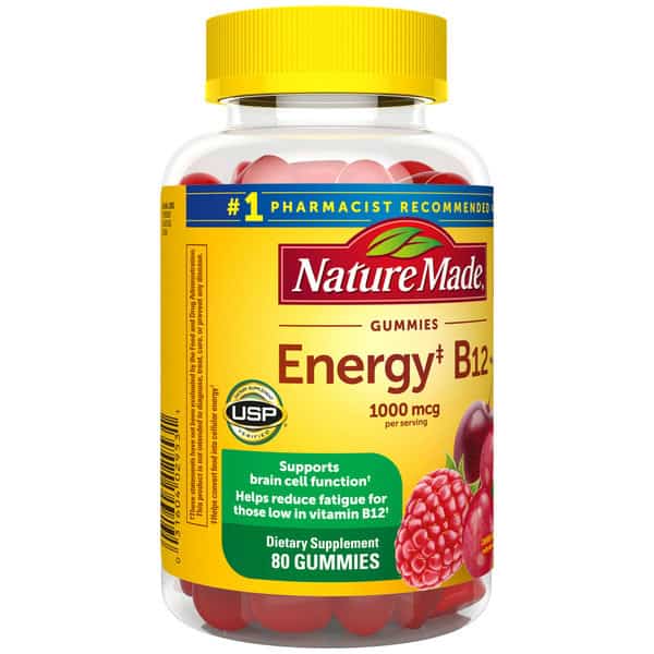 Nature Made (1)Energy B12 1000 mcg Gummies help break down food into energy that your body can use all day long. Sourced from high quality ingredients, this gluten free B12 supplement is a dietary supplement that has no high fructose corn syrup, no synthetic dyes, no artificial flavors, and no artificial sweeteners. This Nature Made Vitamin B12 1000 mcg supplement helps support energy metabolism(1). B12 vitamins are important for vegetarians and vegans who may not consume enough from diet alone. Adults chew two of these Nature Made B12 gummies daily. Nature Made supplements are quality you can trust. USP has tested and verified ingredients, potency and manufacturing process. USP sets official standards for dietary supplements. Visit the USP verified website for more information. (1)Helps convert food into cellular energy. *Based on a survey of pharmacists who recommend branded vitamins and supplements.