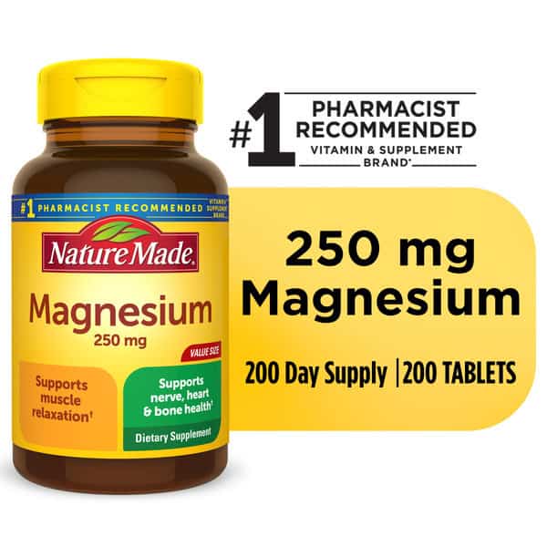 These Nature Made Magnesium Oxide 250 mg Tablets are dietary supplements designed to support muscle relaxation, heart health, bone health and nerve health. These Magnesium supplements are sourced from high-quality ingredients. Nature Made Magnesium 250 mg Tablets are gluten free and contain no synthetic dyes and no artificial flavors. These Nature Made Magnesium tablets provide Magnesium Oxide to help relax the body. With over half of the U.S. population not consuming enough Magnesium in their diet, this Magnesium supplement for women and men helps to contribute to the Magnesium your body needs (1). Adults take one of these Nature Made Magnesium 250mg tablets daily with water and a meal. Nature Made supplements are quality you can trust. (1) Reider, C.A.; Chung, R.-Y.; Devarshi, P.P.; Grant, R.W.; Hazels Mitmesser, S. Inadequacy of Immune Health Nutrients: Intakes in US Adults, the 2005–2016 NHANES. Nutrients 2020, 12, 1735. *Based on a survey of pharmacists who recommend branded vitamins and supplements