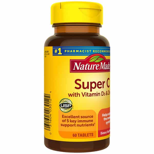 Nature Made Super C with Vitamin D3 & Zinc is a dietary supplement that supports immune health and offers antioxidant support. Sourced from high-quality ingredients, this Nature Made Super C Vitamin C with Zinc and D3 supplement has no artificial flavors. This Nature Made Vitamin C supplement is an excellent source of five key immune system support nutrients. Each Super C vitamin with Zinc and D3 tablet contains 900 mg of Vitamin C, 450 mcg of Vitamin A, 25 mcg of Vitamin D, 15 mg of Vitamin E, and 11 mg of Zinc to lend your immune system a helping hand. This Vitamin C and Zinc supplement is perfect for anyone looking to supplement their diet, especially if it is low in fruits and vegetables. Adults, take one Nature Made Super C with Zinc tablet daily with water and a meal. Nature Made supplements are quality you can trust. USP has tested and verified ingredients, potency, and manufacturing process. USP sets official standards for dietary supplements. Visit the USP verified website for more information. *Based on a survey of pharmacists who recommend branded vitamins and supplements.