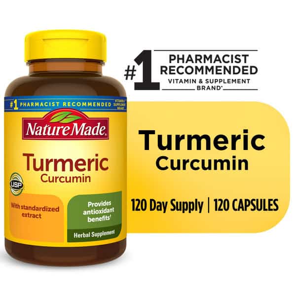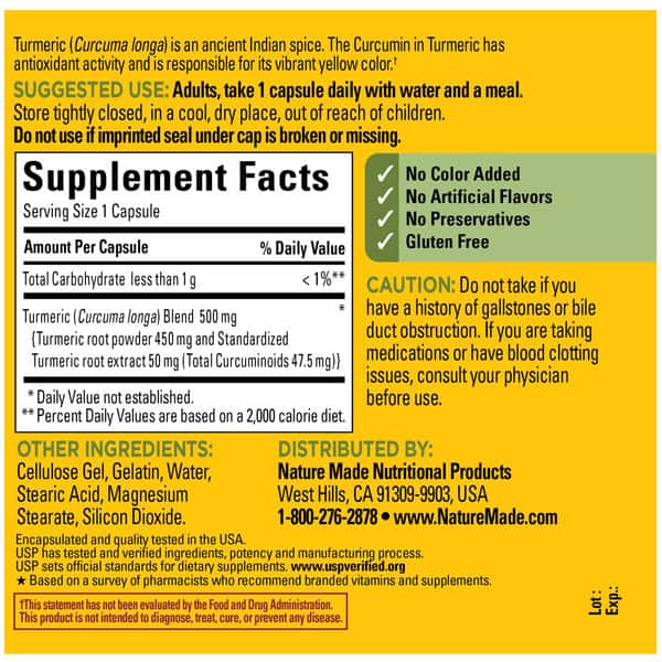 Nature Made Turmeric Curcumin 500 mg Capsules are herbal supplements that provide antioxidant benefits for the body. Sourced from high quality ingredients, these gluten free Turmeric Curcumin supplements have no artificial flavors, no color added, and no preservatives. Turmeric is an Indian spice that has been traditionally used for its health properties. This Turmeric supplement is made with standardized Turmeric extract and gets its vibrant yellow color from Curcumin (and some other curcuminoids), which provides antioxidant activity to help neutralize free radicals in the body. These Turmeric 500mg capsules are perfect for those looking for antioxidant benefits. Adults, take one of these Turmeric 500 mg capsules daily with water and a meal. Store these Tumeric supplements tightly closed, in a cool, dry place, out of reach of children. Nature Made supplements are quality you can trust. USP has tested and verified ingredients, potency and manufacturing process. USP sets official standards for dietary supplements. Visit the USP verified website for more information. *Based on a survey of pharmacists who recommend branded vitamins and supplements.