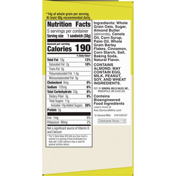 Whole Grain Oats, Sugar, Almond Butter (almonds), Canola Oil, Corn Syrup, Palm Oil, Whole Grain Barley Flakes, Corn Starch, Cinnamon, Salt, Baking Soda, Natural Flavor