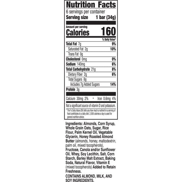 Almonds, Corn Syrup, Whole Grain Oats, Sugar, Rice Flour, Palm Kernel Oil, Vegetable Glycerin, Honey Roasted Almond Butter (almonds, Honey, Maltodextrin, Palm Oil, Mixed Tocopherols), Fructose, Whey, Canola Oil, Salt, Soy Lecithin, Corn Starch, Barley Malt Extract, Baking Soda, Natural Flavor, Vitamin E (mixed Tocopherols) Added To Retain Freshness