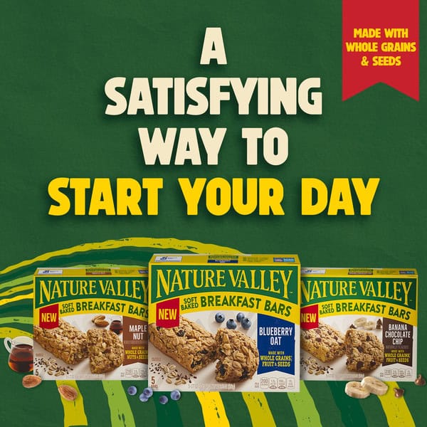 Delight in irresistible Nature Valley Banana Chocolate Chip Soft Baked Bars with a hearty size to help fuel your mornings. Each great-tasting breakfast bar is made with wholesome whole grains, real fruit, flaxseeds, and chia seeds, with 19g of whole grain per serving (at least 48g recommended daily). There are no artificial flavors or colors and no high fructose corn syrup. Ingredients such as whole grain oats help fill you up to avoid hunger slowing you down. These portable snacks are a perfect addition to the pantry, lunch box, work day, after school activities, and beyond. It’s a morning or anytime snack everyone in your household can enjoy. At Nature Valley, we believe that what you put in is what you get out. So wherever the moment takes you and your family, you can rely on our delicious snacks to help keep you going. Contains 5 bars.