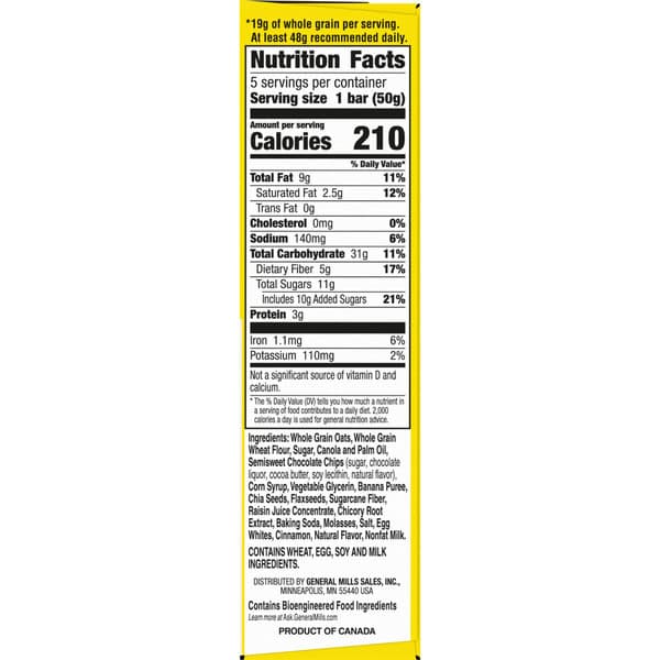 Whole Grain Oats, Whole Grain Wheat Flour, Sugar, Canola And Palm Oil, Semisweet Chocolate Chips (sugar, Chocolate Liquor, Cocoa Butter, Soy Lecithin, Natural Flavor), Corn Syrup, Vegetable Glycerin, Banana Puree, Chia Seeds, Flaxseeds, Sugarcane Fiber, Raisin Juice Concentrate, Chicory Root Extract, Baking Soda, Molasses, Salt, Egg Whites, Cinnamon, Natural Flavor, Nonfat Milk