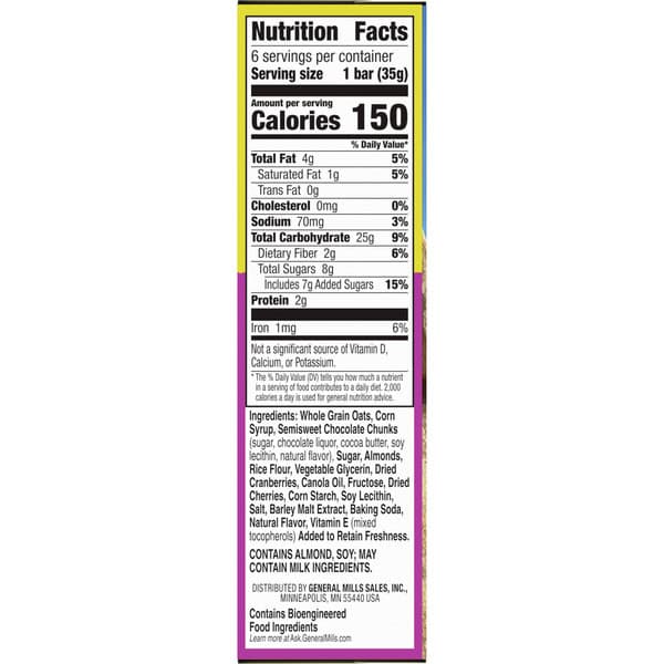 Whole Grain Oats, Corn Syrup, Semisweet Chocolate Chunks (sugar, Chocolate Liquor, Cocoa Butter, Soy Lecithin, Natural Flavor), Sugar, Almonds, Rice Flour, Vegetable Glycerin, Dried Cranberries, Canola Oil, Fructose, Dried Cherries, Corn Starch, Soy Lecithin, Salt, Barley Malt Extract, Baking Soda, Natural Flavor, Vitamin E (mixed Tocopherols) Added To Retain Freshness