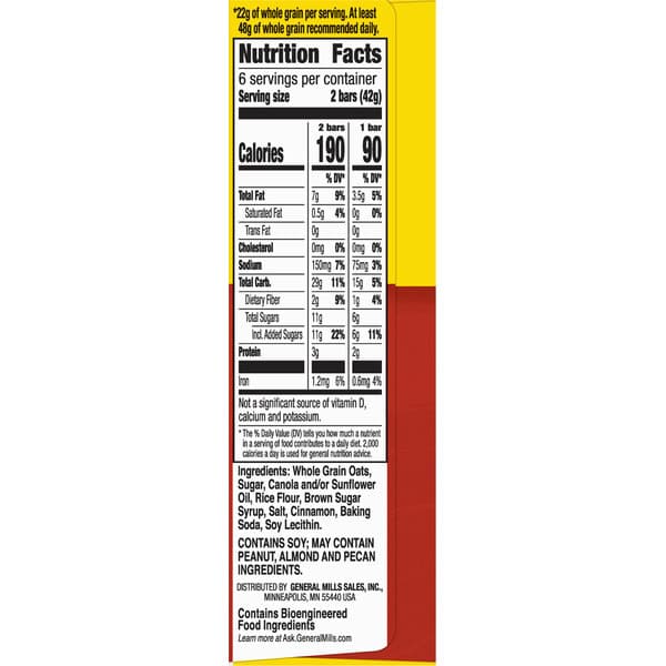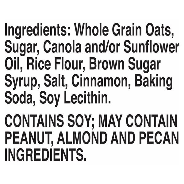 Whole Grain Oats, Sugar, Canola Oil, Rice Flour, Brown Sugar Syrup, Salt, Cinnamon, Baking Soda, Soy Lecithin.