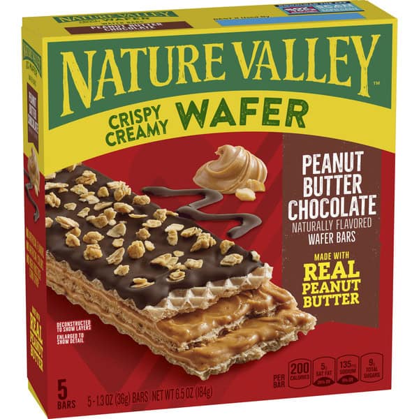 Indulge your crispy, creamy cravings with Nature Valley Peanut Butter Chocolate Wafer Bars. These delectable wafer bars are made with light and crispy wafers, layered with peanut butter, and topped with chocolate coating plus crunchy granola. Reach for these wafer peanut butter chocolate bars during an afternoon break. Make them your go-to for easy lunch box treats. Or take a box along to share with the family when conquering a new trail. Whether you’re heading off the beaten path or into your own backyard, our wafer bars make an ideal choice wherever you are. At Nature Valley, we believe that what you put in is what you get out. So wherever the moment takes you and your family, you can rely on our great-tasting snacks to help keep you going. Contains 5 bars.