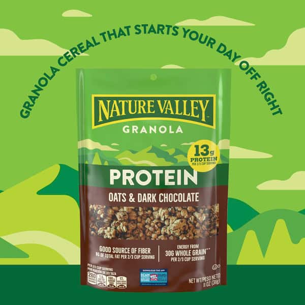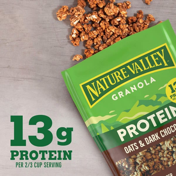 • CONTAINS: One plastic pouch of crunchy Nature Valley Protein Granola, Oats and Dark Chocolate Granola, 11 oz; Perfect for instant snacking, or a part of breakfast and meals