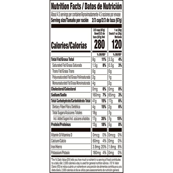 • PROTEIN GRANOLA: Each 2/3 cup serving provides 13g protein and energy from 30g whole grain (at least 48g recommended daily), plus a good source of fiber (8g of total fat per 2/3 cup serving)