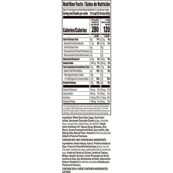 Whole Grain Oats, Sugar, Soy Protein Isolate, Semisweet Chocolate Chunks (sugar, Chocolate Liquor, Cocoa Butter, Natural Flavor, Soy Lecithin), Canola And/or Sunflower Oil, Tapioca Syrup, Molasses, Rice Starch, Cocoa Processed With Alkali, Soy Lecithin, Salt, Baking Soda, Natural Flavor, Vitamin E (mixed Tocopherols) Added To Preserve Freshness