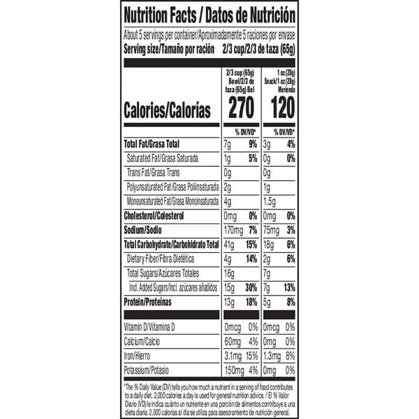 • PROTEIN GRANOLA: Each 2/3 cup serving provides 13g protein and energy from 33g whole grain (at least 48g recommended daily), plus a good source of fiber (7g of total fat per 2/3 cup serving)