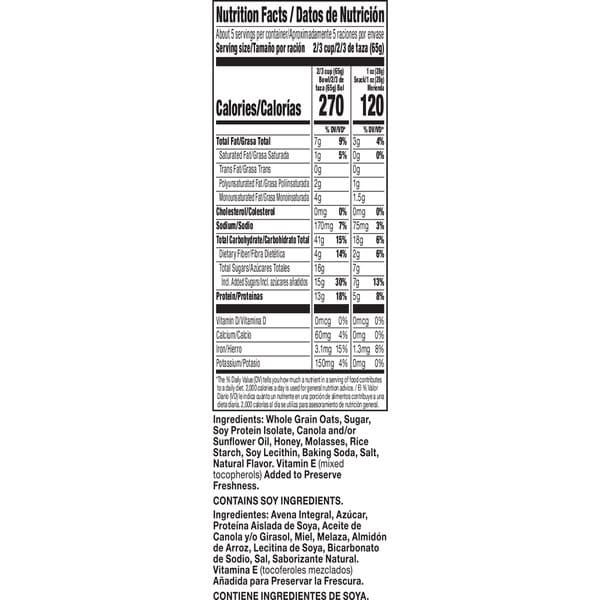 Whole Grain Oats, Sugar, Soy Protein Isolate, Canola And/or Sunflower Oil, Honey, Molasses, Rice Starch, Soy Lecithin, Baking Soda, Salt, Natural Flavor, Vitamin E (mixed Tocopherols) Added To Preserve Freshness