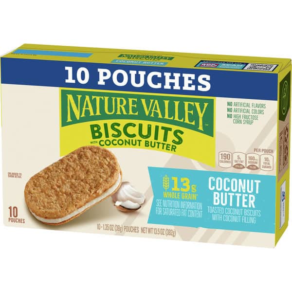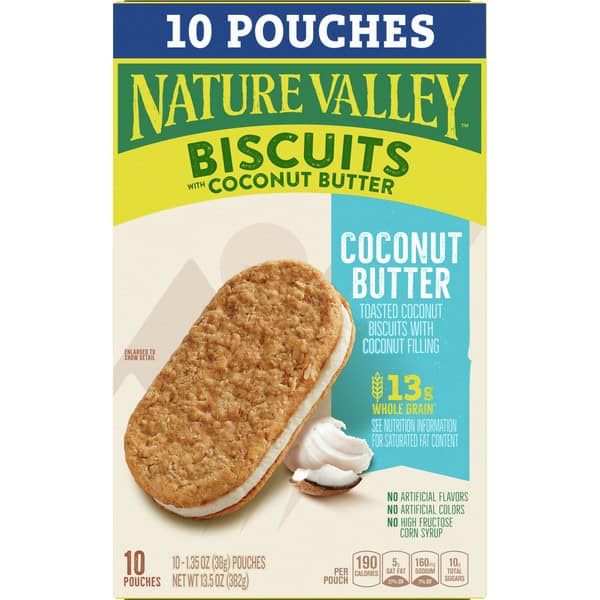 Crispy. Creamy. Gone. Nature Valley Whole Grain Coconut Butter Biscuit Sandwiches are made with whole grain oats and have a coconut butter filling for a convenient and delicious on-the-go snack. Make Nature Valley Biscuit Sandwiches your go-to for an easy breakfast food or anytime bite. They contain no high fructose corn syrup and no artificial flavors.Pack portable snack pouches for lunch box treats, the hiking trail or road trip snacks.Or enjoy them as part of an afternoon break. At Nature Valley, we believe that what you put in is what you get out. So wherever the moment takes you and your family, you can rely on our great-tasting snacks to help keep you going. Contains 10 pouches.