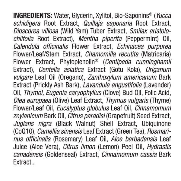 Water, Glycerin, Xylitol, Bio-saponins® (yucca Schidigera Root Extract, Quillaja Saponaria Root Extract, Dioscorea Villosa (wild Yam) Tuber Extract, Smilax Aristolochiifolia Root Extract), Mentha Piperita (peppermint) Oil, Calendula Officinalis Flower Extract, Echinacea Purpurea Flower/leaf/stem Extract, Chamomilla Recutita (matricaria) Flower Extract, Phytoplenolin® (centipeda Cunninghamii Extract), Centella Asiatica Extract (gotu Kola), Origanum Vulgare Leaf Oil (oregano), Zanthoxylum Americanum Bark Extract (prickly Ash Bark), Lavandula Angustifolia (lavender) Oil, Thymol, Eugenia Caryophyllus (clove) Bud Oil, Folic Acid, Olea Europaea (olive) Leaf Extract, Thymus Vulgaris (thyme) Flower/leaf Oil, Eucalyptus Globulus Leaf Oil, Cinnamomum Zeylanicum Bark Oil, Citrus Paradisi (grapefruit) Seed Extract, Juglans Nigra (black Walnut) Shell Extract, Ubiquinone (coq10), Camellia Sinensis Leaf Extract (green Tea), Rosmarinus Officinalis (rosemary) Leaf Oil, Aloe Barbadensis Leaf Juice (aloe Vera), Citrus Limon (lemon) Peel Oil, Hydrastis Canadensis (goldenseal) Extract, Cinnamomum Cassia Bark Extract..