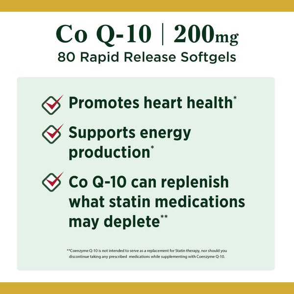 Nature’s Bounty Q-Sorb Coenzyme Q-10 200 Mg Softgels support heart health and energy production.* As an antioxidant, it helps fight cell-damaging free radicals in the body.* In addition, statin medications can reduce Nature’s Bounty Co Q-10 levels in the body. Co Q-10 can replenish what Statin medications may deplete.**