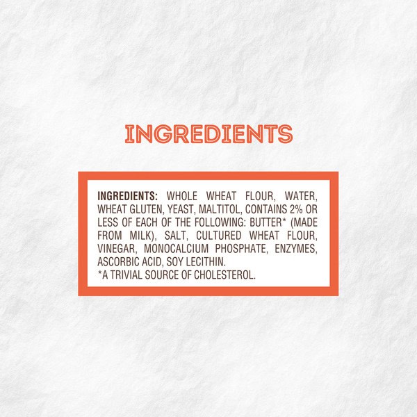 Whole Wheat Flour, Water, Wheat Gluten, Yeast, Maltitol, Contains 2% Or Less Of Each Of The Following, Butter (made From Milk), Salt, Cultured Wheat Flour, Vinegar, Monocalcium Phosphate, Enzymes, Ascorbic Acid, Soy Lecithin.
