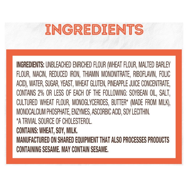 Unbleached Enriched Flour (wheat Flour, Malted Barley Flour, Niacin, Reduced Iron, Thiamin Mononitrate, Riboflavin, Folic Acid), Water, Sugar, Yeast, Wheat Gluten, Pineapple Juice Concentrate, Contains 2% Or Less Of Each Of The Following: Soybean Oil, Salt, Cultured Wheat Flour, Monoglycerides, Butter* (made From Milk), Monocalcium Phosphate, Enzymes, Ascorbic Acid, Soy Lecithin.