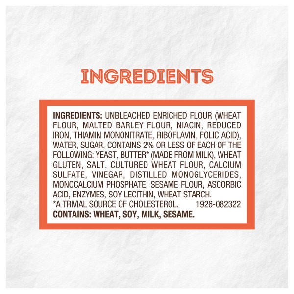 Unbleached Enriched Flour (wheat Flour, Malted Barley Flour, Niacin, Reduced Iron, Thiamin Mononitrate, Riboflavin, Folic Acid), Water, Sugar, Contains 2% Or Less Of Each Of The Following: Yeast, Butter* (made From Milk), Soy Flour, Wheat Gluten, Cultured Wheat Flour, Salt, Calcium Sulfate, Vinegar, Monoglycerides, Enzymes, Monocalcium Phosphate, Ascorbic Acid, Niacin, Reduced Iron, Thiamin Mononitrate, Riboflavin, Folic Acid, Soy Lecithin.