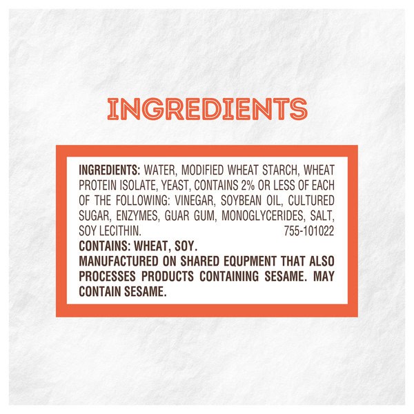 Water, Modified Wheat Starch, Wheat Protein Isolate, Yeast, Contains 2% Or Less Of Each Of The Following: Vinegar, Soybean Oil, Cultured Sugar, Enzymes, Guar Gum, Monoglycerides, Salt, Soy Lecithin.