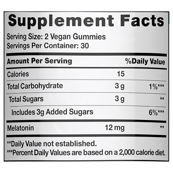 Directions: For adults, take two (2) vegan gummies 30 minutes before bedtime as Melatonin may cause drowsiness. This product is intended for short term, occasional use only. Do not exceed recommended dosage.