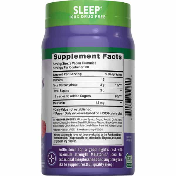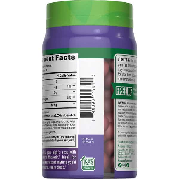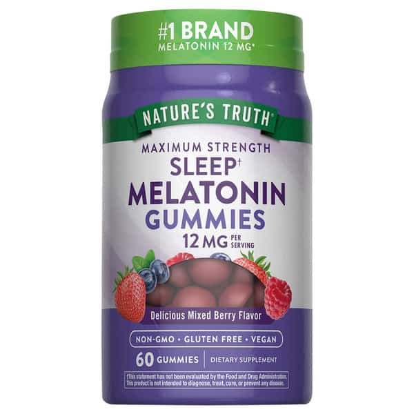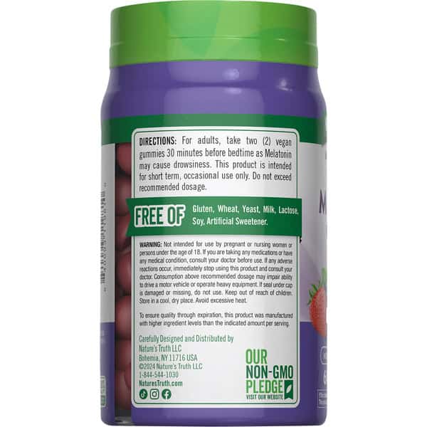 Melatonin is naturally produced by the body and works in harmony with your natural cycle. The body’s ability to produce this naturally occurring hormone may begin to decline with age, so you can support it with a trusted Melatonin supplement. Each serving of our Melatonin gummies delivers 12 mg of Melatonin. These vegan gummies are a delicious mixed berry flavor and are a wonderful alternative for those who dislike or have trouble swallowing pills. Our maximum strength formula is 100% drug free and can be used for occasional sleeplessness.†Additionally, our Melatonin gummies are non-GMO, vegan, and free of gluten, wheat, yeast, milk, lactose, soy, and artificial sweetener. Nature’s Truth vitamins and supplements was born out of a passion for healthy living and a dedication to sharing unique wellness solutions with the world. Over the years, Nature’s Truth has led the industry with new innovative products that contain trending ingredients consumers want and need. Discover Nature’s Truth – where your wellness journey begins. †These statements have not been evaluated by the Food and Drug Administration. This product is not intended to diagnose, treat, cure, or prevent any disease.