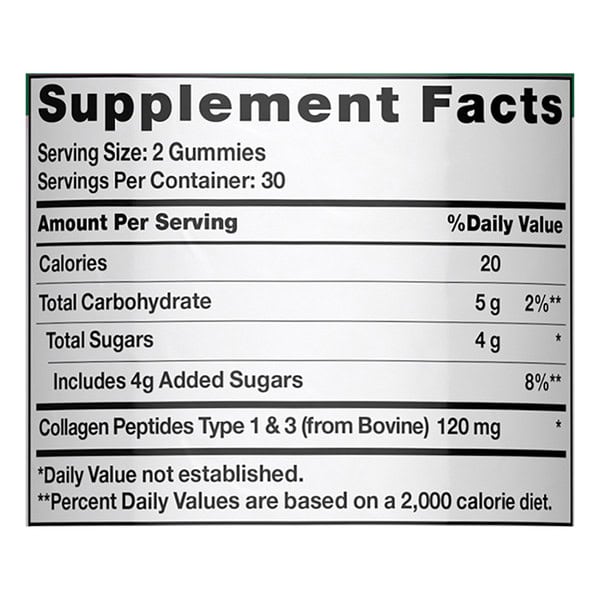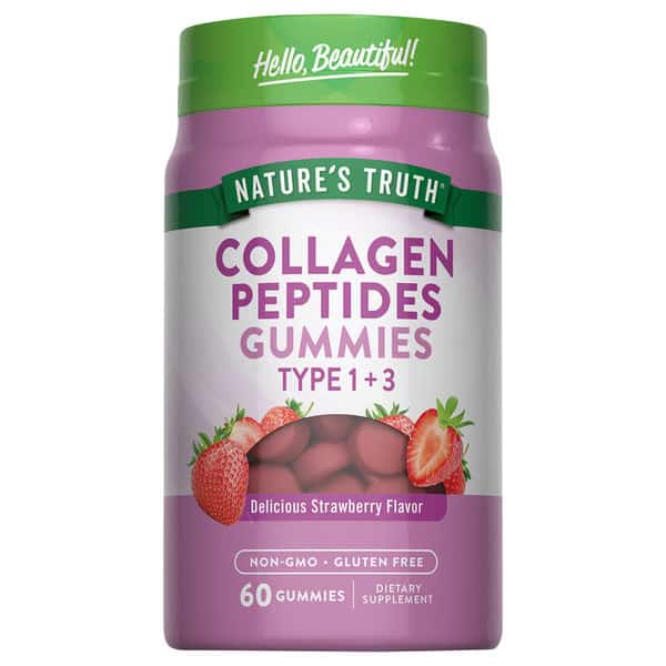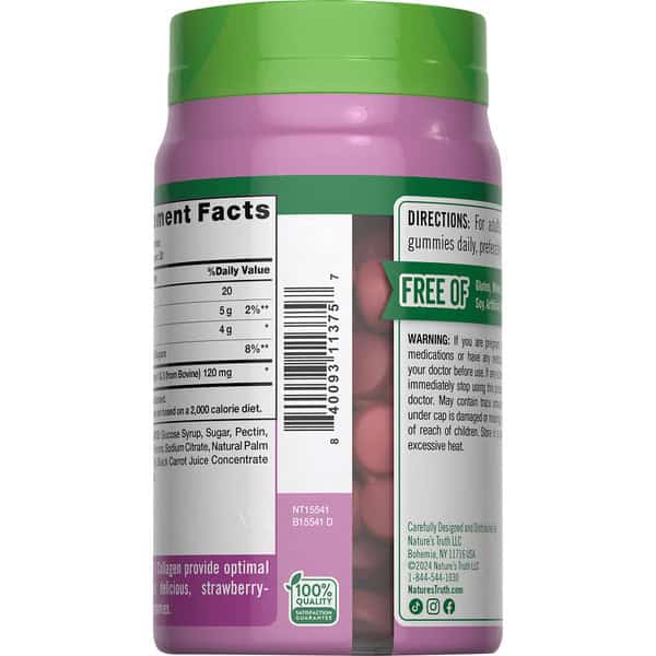 Collagen is one of the most abundant proteins in the human body and is found throughout all connective tissue. With a strong presence in hair, skin, and nails, Collagen has quickly become a favorite beauty ingredient for men and women. Our Collagen Peptides Gummies provide a convenient and delightful way to boost your daily collagen intake. Each serving offers 120 mg of Collagen Peptides Type 1 & 3 from bovine. Enjoy optimal collagen support in delicious strawberry-flavored gummies. Adults can take two gummies daily, preferably with a meal, to reap the full benefits of this supplement. Additionally, our formula is non-GMO and free of gluten, wheat, yeast, milk, lactose, soy, and artificial sweetener. Nature’s Truth vitamins and supplements was born out of a passion for healthy living and a dedication to sharing unique wellness solutions with the world. Over the years, Nature’s Truth has led the industry with new innovative products that contain trending ingredients consumers want and need. Discover Nature’s Truth – where your wellness journey begins.