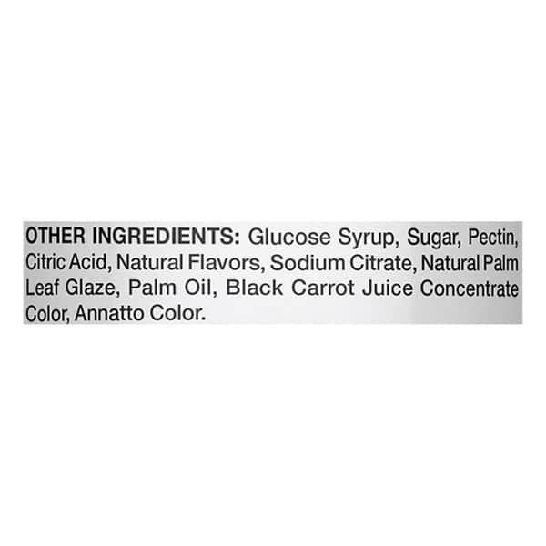 Glucose Syrup, Sugar, Pectin, Citric Acid, Sodium Citrate, Natural Strawberry Flavor, Natural Palm Leaf Glaze, Palm Oil, Black Carrot Juice Concentrate Color, Annatto Color.