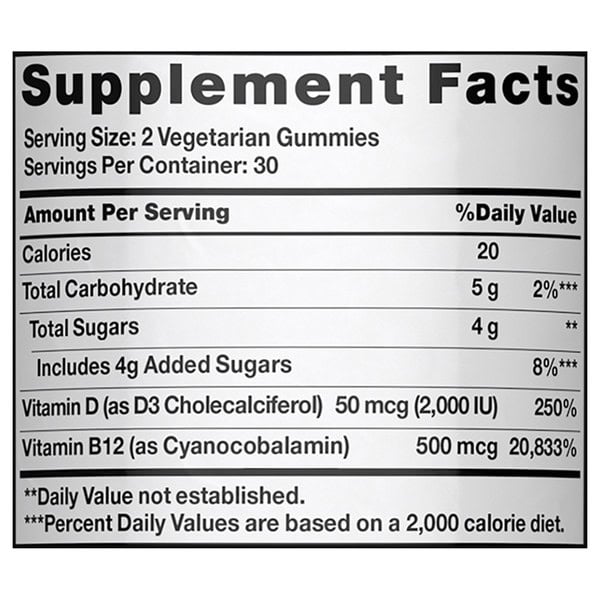 • 500 mcg of Vitamin B12 (as Cyanocobalamin) per serving