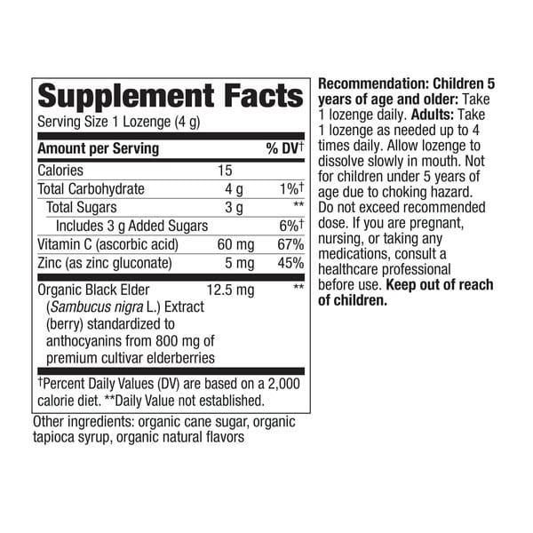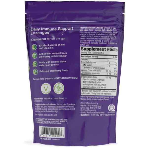 Nature’s Way Sambucus Immune Lozenges support immune health with an excellent source of zinc and vitamin C, plus organic black elderberry extract.* Toss these convenient and great tasting original elderberry flavored lozenges in your bag or keep them at your desk for immune support whenever you need it.* *This statement has not been evaluated by the Food and Drug Administration. This product is not intended to diagnose, treat, cure, or prevent any disease.