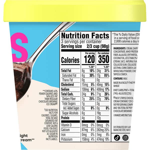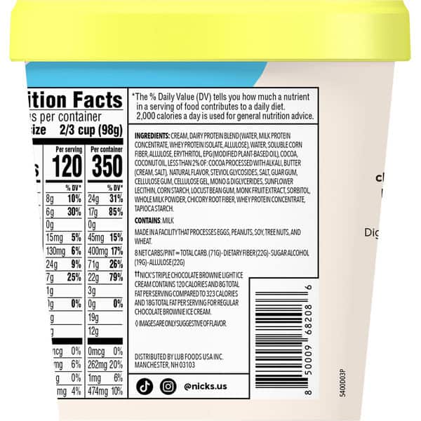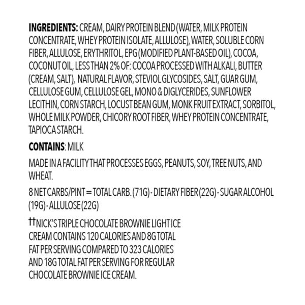 Skim Milk, Brownie Dough (wheat Flour, Erythritol, Butter (pasteurized Cream, Salt), Cocoa Processed With Alkali, Water, Allulose, Chicory Root Fiber, Sunflower Oil, Corn Starch, Salt, Vanilla Extract, Monk Fruit Extract), Soluble Corn Fiber, Allulose, Epg (modified Plant-based Oil), Erythritol, Cocoa Powder Treated With Alkali, Dark Choco Flakes (coconut Oil, Cocoa, Erythritol, Sunflower Lecithin, Salt, Cocoa (processed With Alkali), Vanilla Extract, Monk Fruit), Milk Protein Concentrate, Sorbitol, Coconut Oil, Xylitol, Whey Protein Isolate, Acacia Gum, Modified Starch, Natural Flavor, Guar Gum, Salt, Tara Gum, Stevia And Monk Fruit Extract, Carob Bean Gum.