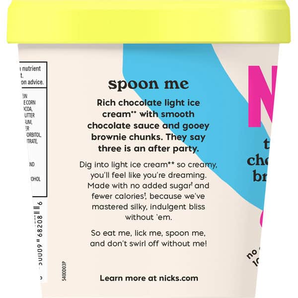 Sweden is a minimalist culture. We believe there’s beauty in the bare necessities. But here we are in Amerika! We’ve discovered that there’s nothing wrong about mixing some choklad with more choklad and then adding some extra choklad. Our rich velvety choklad light ice cream (Contains 59% fewer calories and 59% less fat than regular ice cream [Nick’s triple choklad light ice cream contains 110 calories and 7g total fat per serving compared to 270 calories & 17 g total fat per serving of regular ice cream]) is filled with chewy brownie bits and then swirled with a silky ribbon of choklad. Let’s say choklad one more time. So long, minimalism! Sa creamy!