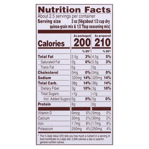 Range Top Directions: 1. In medium saucepan, bring quinoa and brown rice blend, 2 cups water, and 1 teaspoon olive oil to a boil. 2. Turn heat to a medium boil, add contents of Spice Sack and mix well. 3. Boil gently with lid on for 19-22 minutes until water is absorbed. 4. Remove from heat. Let stand for 5 minutes. Fluff with a fork before serving. High Altitude Preparation: At high altitudes, increase water to 2-1/4 cups and cook time by 5-10 minutes. Low Fat Directions: Follow package directions, except omit olive oil. (See Nutrition Facts for sodium content.) Microwave Directions: 1. In round 2-quart microwaveable glass casserole, combine quinoa and brown rice blend, 2 cups water, 1 teaspoon olive oil, and contents of Spice Sack. 2. Cover; microwave at high for 6 minutes. Stir. 3. Cover; microwave at high for 9 to 12 minutes or until all water is absorbed. (Microwave ovens may vary. Adjust times as needed) 4. Let stand about 5 minutes. 5. Fluff lightly with fork before serving.