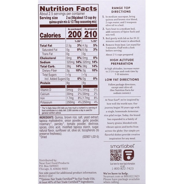 At Near East, we’re inspired by how well the world eats. Our journey began 50 years ago with a single, homemade Armenian rice pilaf recipe. Today, the brand has expanded to a family of hearty grains, blended with vibrant spices and herbs from across the globe. Our simple yet flavorful dishes provide creative inspiration for any meal. Grain mix filled to this line. Package contains empty space to accommodate grain to seasoning ratio. This package is sold by weight, not by volume. Contents may settle during shipping and handling. Fair Trade Certified ingredient. See back panel (Quinoa: Fair Trade Certified by Fair Trade USA). At least 40% of Fair Trade Certified ingredients.