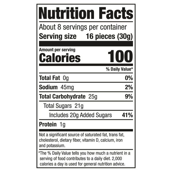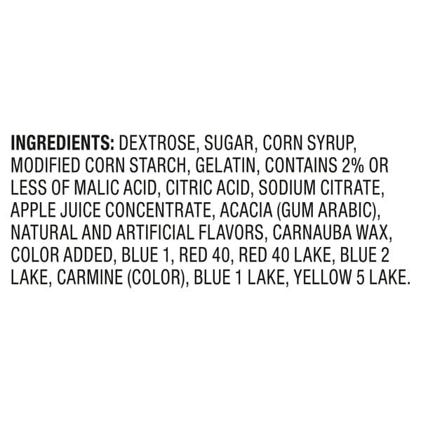 Dextrose, Sugar, Corn Syrup, Modified Corn Starch, Gelatin, Contains 2% Or Less Of Malic Acid, Citric Acid, Sodium Citrate, Apple Juice Concentrate, Acacia (gum Arabic), Natural And Artificial Flavors, Carnauba Wax, Color Added, Blue 1, Red 40, Red 40 Lake, Blue 2 Lake, Carmine (color), Blue 1 Lake, Yellow 5 Lake