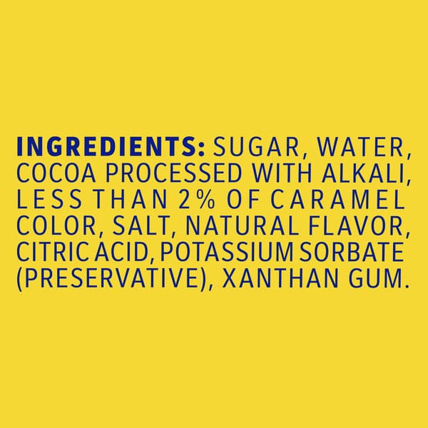 Sugar, Water, Cocoa Processed With Alkali, Less Than 2% Of Salt, Citric Acid, Artificial Flavor, Potassium Sorbate (preservative), Xanthan Gum, Caramel Color, Red 40, Blue 1, Yellow 6