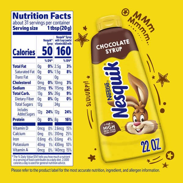• QUICK AS A BUNNY: Make chocolate milk fast anytime you want a sweet treat by adding two teaspoons to eight ounces of low-fat milk. This bottle of Nesquik® syrup contains about thirty-one servings