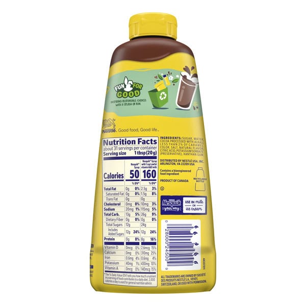 Start your day off right with Nestlé® Nesquik® Chocolate Syrup, just add two teaspoons to an eight-ounce glass of low-fat milk and stir for a cold, sweet and nostalgic chocolate milk. This twenty-two-ounce bottle has about thirty-one servings of Nesquik® Syrup that can be added to milk, your favorite dairy alternative, or poured on ice cream like chocolate sauce for an epic sundae. Any way you sweeten up your day, you can feel good about using Nesquik® chocolate syrup with no artificial sweeteners, flavors, colors*, or high fructose corn syrup. So go ahead, squeeze, stir, and spark some greatness with a sip. *Added colors from natural sources